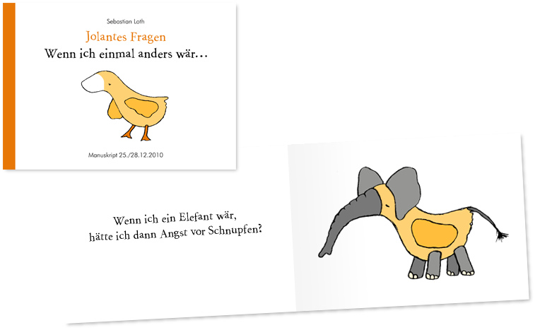 Das Manuskript Der Arbeitstitel dieses Buches bzw. der Titel des Manuskriptes lautet "Wenn ich einmal anders wär..." Der Überschrift "Jolantes Fragen" kann man entnehmen, dass es sich bei diesem "Character" um die kleine Gans "Jolante" handelt, die bereits im ersten Bilderbuch "Jolante sucht Crisula" die Hauptfigur spielte. |