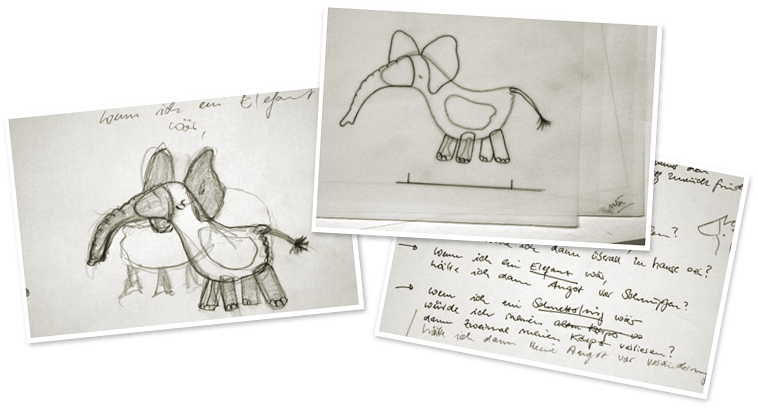 Die Skizzen "Der Elefant" (unten links) ist die erste Skizze, die im Zusammenhang mit diesem Buch gezeichnet wurde. Der Text und die Bilder sind am 25.12.2010 fast parallel entstanden. Binnen vier Tagen waren sowohl der Manuskripttext, wie auch die meisten der insgesamt zwanzig Tierskizzen fertig. |