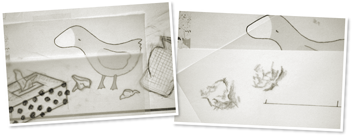 Bei den Reinzeichnungen von der kleinen Gans und den Tierverkleidungen (mitte) handelt es sich um Bleistiftzeichnungen auf Papier und Transparent-papier. Die verschiedenen Ebenen werden einzeln abfotografiert und im PC nachbearbeitet. Hier erhalten die Figuren auch ihre Farbe. |