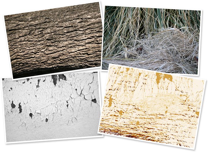 Für den Strukturhintergrund des "Elefanten" wurden drei Fotografien miteinander verwoben: Ein Baumstamm, ein Schilfgewächs und ein altes Fachwerk (siehe unten). Alle Fotografien entstanden gezielt auf der Suche nach "Strukturen" in der Umgebung. |