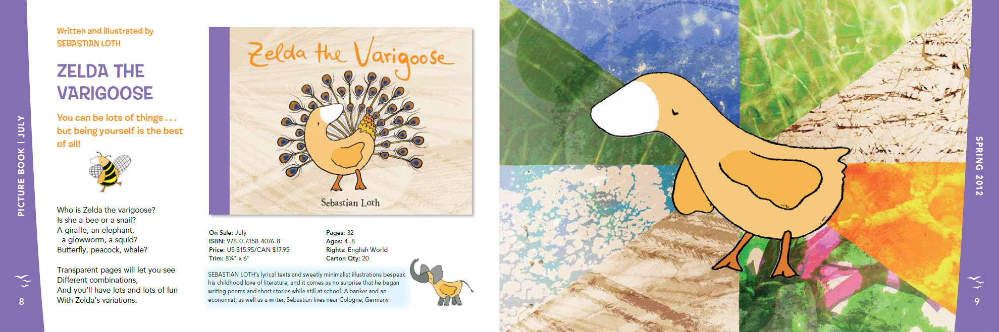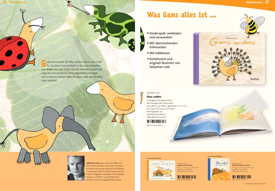 Gans anders | Sebastian Loth NordSüd Verlag (02|2012) ISBN: 978-3-314-10072-7 gebundene Ausgabe | Halbleinen 32 Seiten | 12 farbigen Folienseiten | 21 x 15 cm 12,95 € (D) | 13,40 € (A) | CHF 19,80 Ab 4 Jahren deutsch | englisch französisch | rätoromanisch |