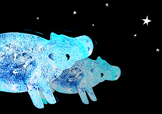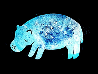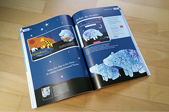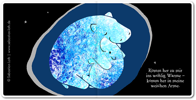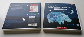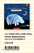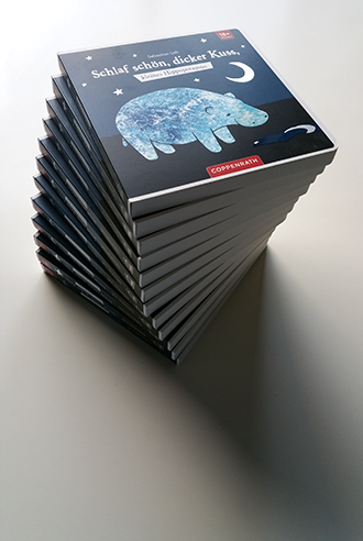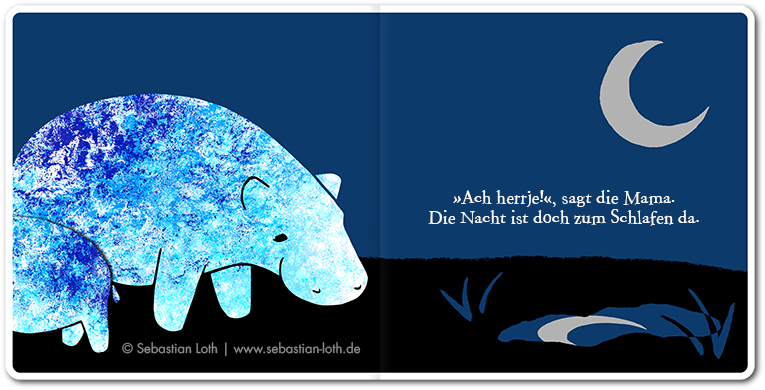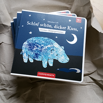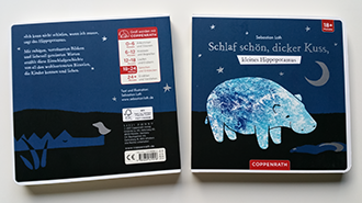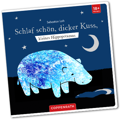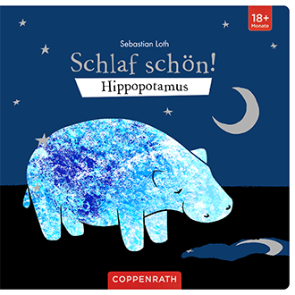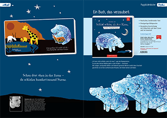 Besonderheiten • Der Text des Buches ist vollständig in Reimform geschrieben. • Die matte Silberfolie ist das Highlight der Ausstattung. Mond und Sterne erreichen so eine ganz besondere Leuchtkraft. • Der Farbraum ist mit Dunkelblau und Schwarz in Verbindung mit weißer Schrift und weißem Seitenrand auffallend anders. Er bietet einen schönen Kontrast zur kräftigen Hippopotamus-Färbung. Mutig durchbricht er damit die übliche Farbgebung bei deutschen Pappbilderbüchern. • Ein seidenmatter Lack schützt die Seiten und bringt die Farbe gut hervor, ohne von der Silberfolie zu sehr abzulenken. • Spotlack findet sich zusätzlich auf dem Cover. Das Hippopotamus wird damit betont und in der mondspiegelnden Pfütze entsteht ein sehr schöner Wassereffekt. |