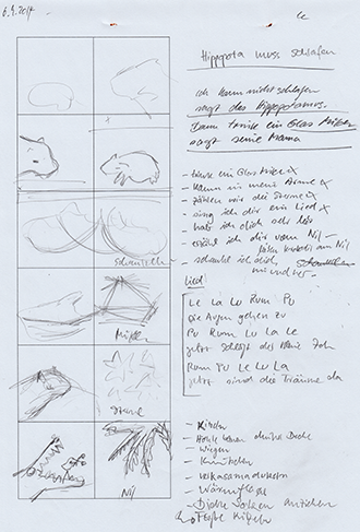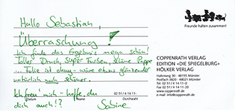 ![]() • Mein bevorzugter Coverentwurf mit dem Titel "Schlaf schön! Hippopotamus" und Sternchen auf dem Rücken. ![]() ![]() • Erstes Scribbeln und Textideen vom 06.09.2014 ![]() • Mit diesem netten Schreiben habe ich am 15.03.2017 mein erstes Vorabexemplar bekommen. Die Überraschung ist echt gelungen! |