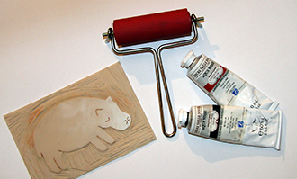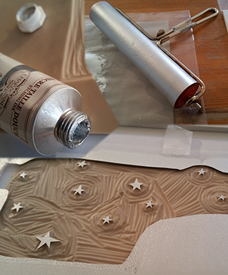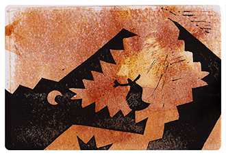 Der Druck der Soft-Cut-Platte (Lenoldrucktechnik) mit Encre Taille Douce Etching Ink Charbonel Aqua Wash (286 Mittelschwarz F66 und 397 Rötel) ist in rötel / schwarz angelegt. |