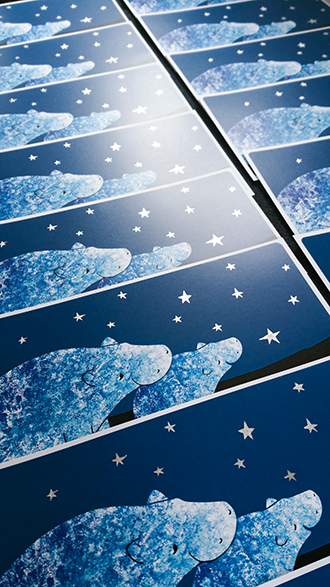Postkarten Als private Werbung für das Buch gibt es eine Postkarte. Da der Druck mit Silberfolie viel zu teuer gewesen wäre, wurden die silbernen Sterne kurzerhand nachträglich selbst gedruckt. Das Ergebnis kann sich wirklich sehen lassen ;-) • Format: 12,5 x 23,5 cm • 300g Diplomatenkarton • 05.11.2017 • Auflage: 60 Stück | 50/2478 (davon 30 Stück mit Sternen) |