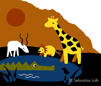 Erst bei der Ausarbeitung für das Buch im November 2016 habe ich die Illustrationstechnik grundlegend geändert. Die Tiere wurden mit Bleistift auf Transparentpapier gezeichnet und anschließend eingescannt. Für die groben Hintergrundlinien habe ich Schwarzkreide verwendet. |